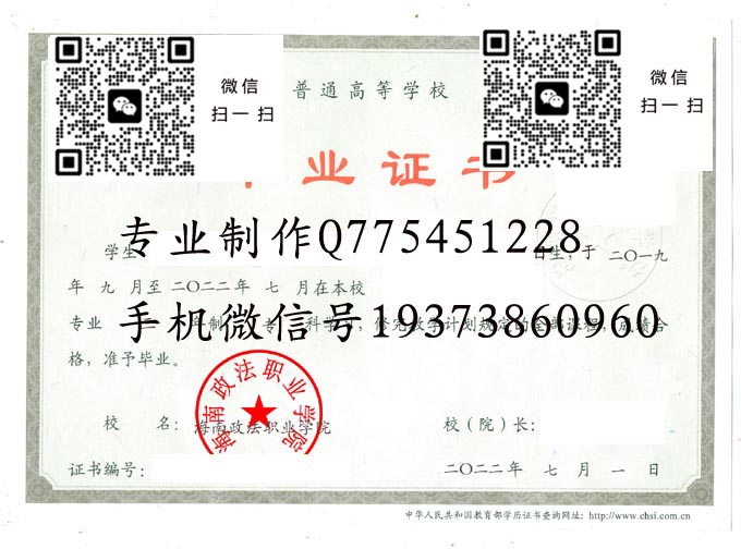海南政法职业学院历届毕业证样本